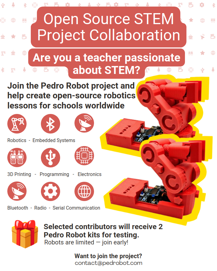 Pedro is a fully open-source, 3D-printable, portable educational robot designed for learning robotics, electronics, and programming. Pedro empowers students, makers, and educators to explore STEM hands-on. As an open-source project, the entire Pedro ecosystem is available on GitHub. Each Pedro repository serves a specific role within the ecosystem: